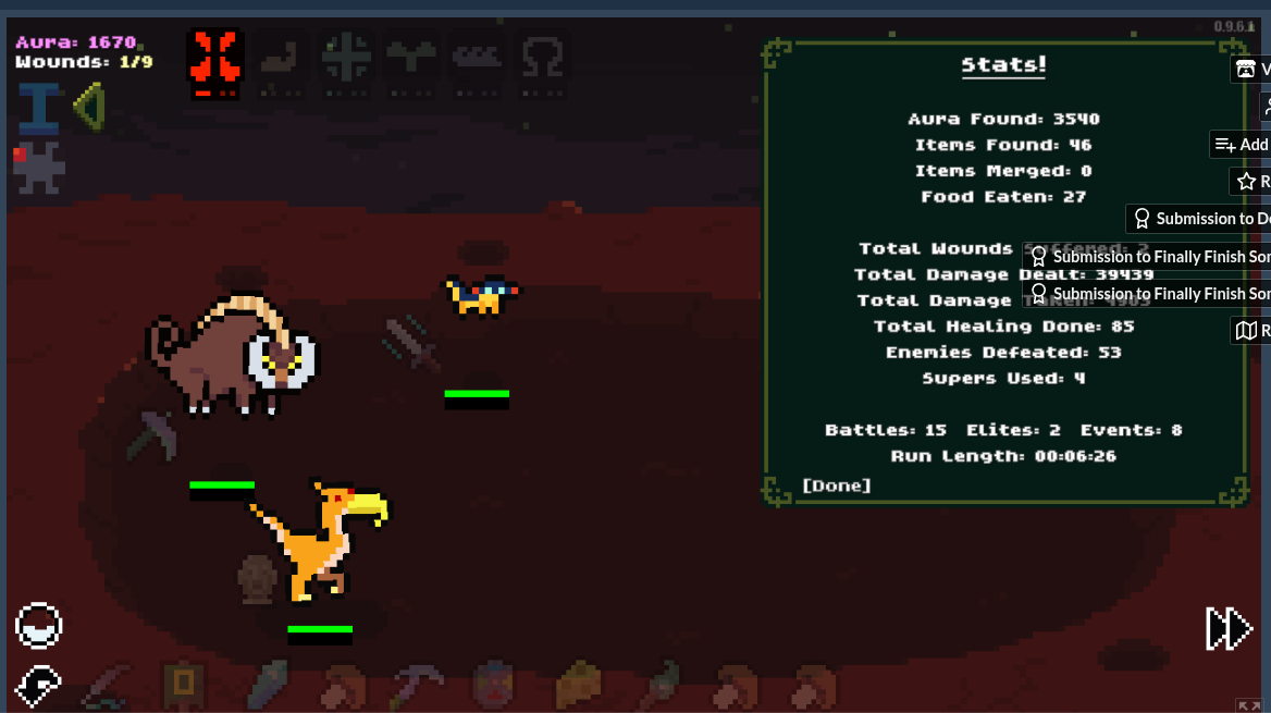 1 hr of attempts, done with 4 forges to reroll for stick effigy faster, and using partial hatching/evolution skip. Had some sub 5s but kept getting aurite instead of an egg for a third monster by accident and then just dying to the final bosses. Maybe I'll record some runs. (also the fullscreen is indeed broken lol)