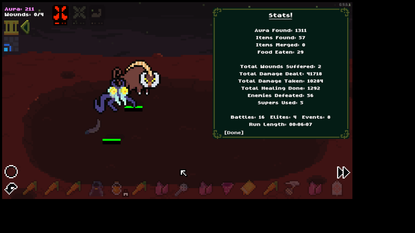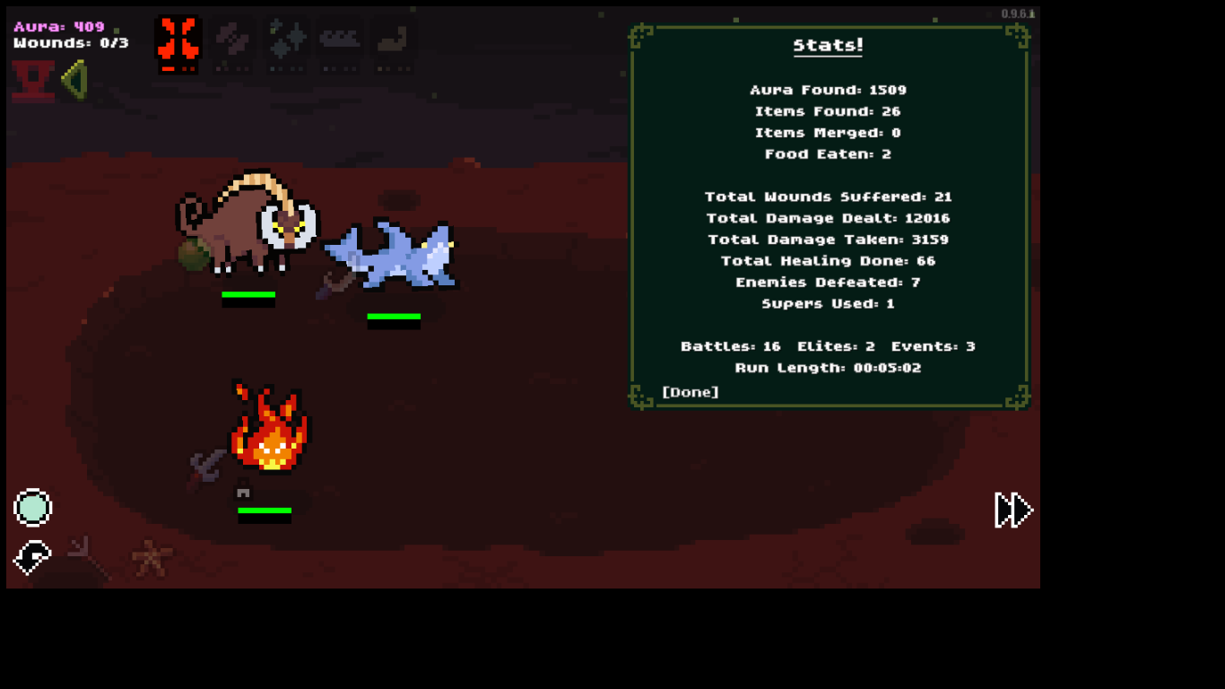 1 hr of attempts, done with 4 forges to reroll for stick effigy faster, and using partial hatching/evolution skip. Had some sub 5s but kept getting aurite instead of an egg for a third monster by accident and then just dying to the final bosses. Maybe I'll record some runs. (also the fullscreen is indeed broken lol)